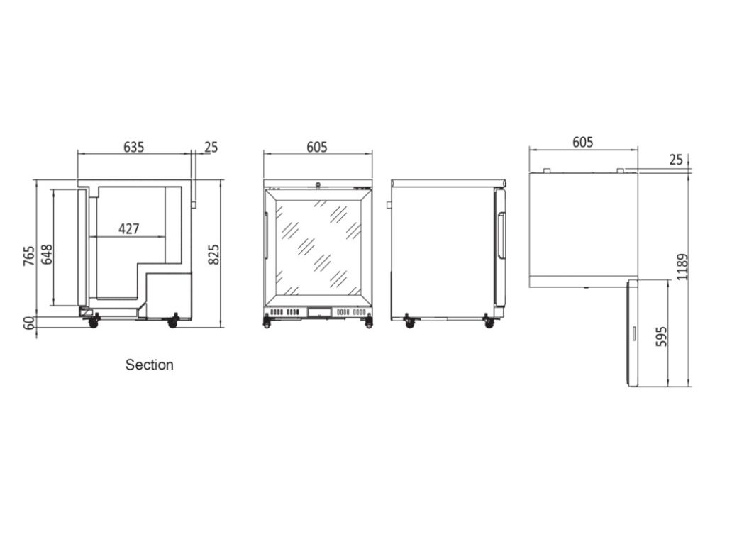 Frigider profesional din inox cu 1 usa din sticla, Ideal Inox, 145 l, 605×635×825