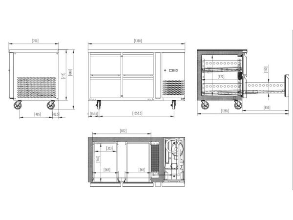Masa frigorifica inox 4 sertare, temperatura reglabila -2 ...+8°C, afisaj digital si termostat electronic, decongelare automata. Usa se inchide automata. Agregat in partea dreapta. Compatibil cu tavi tip gastronom 1/1 - 150. 4 roti dintre care 2 roti cu sistem de franare.