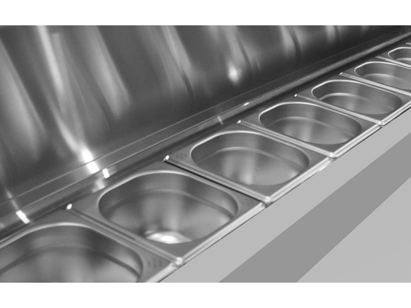 Salatiera cu dulap frigorific cu trei compartimente si blat din inox, temperatura +2°C / +8°C.