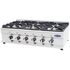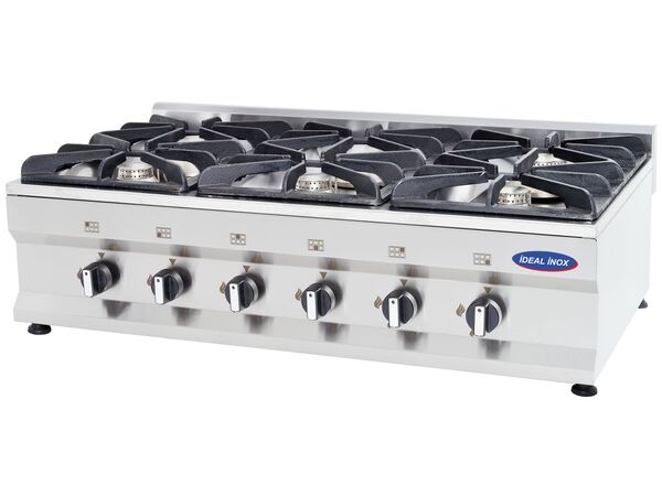 Aragaz inox cu 6 focuri, de banc, constructie inox, valva de siguranta si termocupla, fiecare arzator functioneaza independent, finisaje scotch brite, picioare reglabiile pe inaltime. Arzator cu flacara dubla. Se va utiliza cu un regulator de presiune.