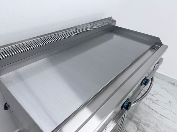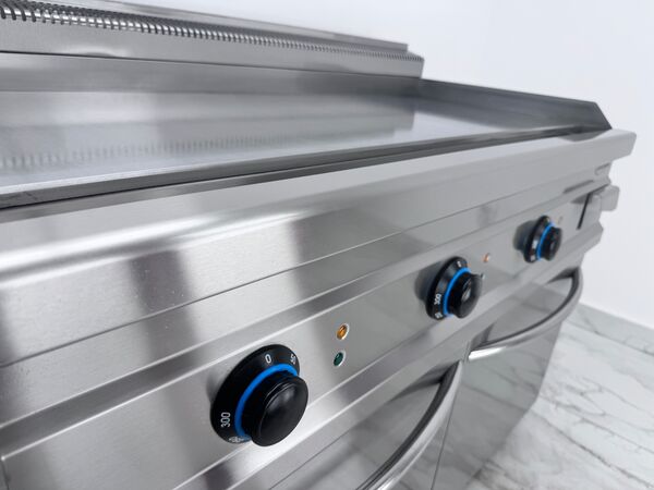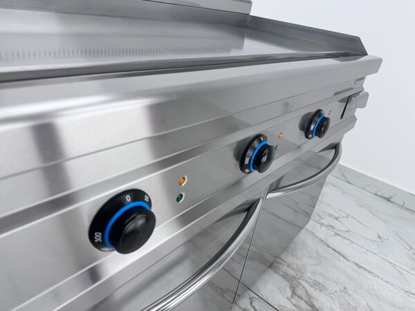 Gratar electric profesional cu suprafata neteda, de banc. Corp constructie inox, finisaje scotch-brite, colturi rotunjite pentru igiena sporita si curatare usoara. Echipat cu termostat de siguranta si reglaj precis al temperaturii intre 50°C si 300°C, pentru control optim al procesului de gatire. Suprafata de gatire este realizata din placa neteda de 12 mm, asigurand distributia uniforma a caldurii si rezultate constante. Dispune de 3 zone independente de gatire, fiecare cu comenzi separate, pentru o utilizare eficienta in fluxuri profesionale. Include protectie anti-stropire, sertar de scurgere a grasimii detasabil, lampi de monitorizare a tensiunii si functionarii, precum si picioare reglabile pe inaltime pentru stabilitate perfecta pe suprafata de lucru.