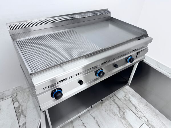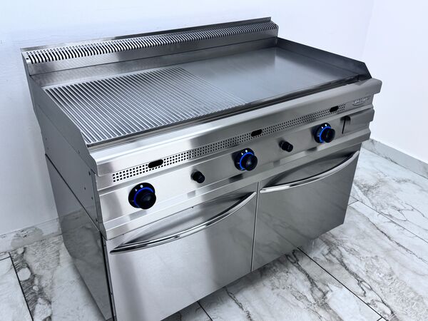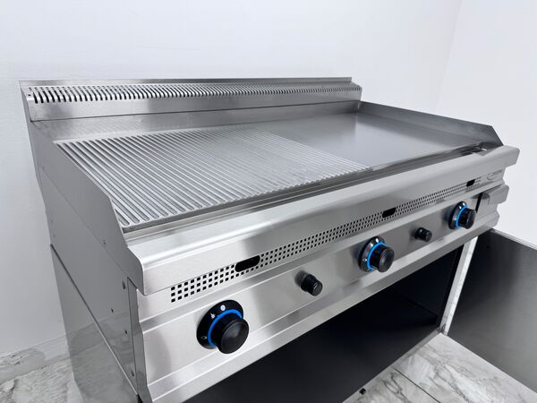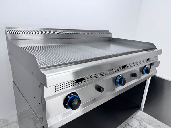 Gratar profesional de banc, functionand pe gaz natural, prevazut cu placa combinata – neteda si striata – cu grosime de 12 mm, ideala pentru prepararea uniforma a alimentelor. Corpul este realizat integral din inox, cu finisaje Scotch-Brite, colturi rotunjite pentru o igienizare usoara si durabilitate sporita in mediul profesional. Echipamentul este dotat cu valva de siguranta si termocupla, arzatoare cu flacara pilot (flacara de veghe) si aprindere piezo-electrica pentru o utilizare sigura si rapida. Dispune de 3 zone de ardere independente, fiecare arzator putand fi controlat separat, asigurand o flexibilitate maxima in gatire. Include protectie impotriva stropilor, sertar de colectare a grasimii detasabil pentru o curatare usoara si picioare reglabile pe inaltime pentru adaptare perfecta la suprafata de lucru.
