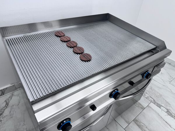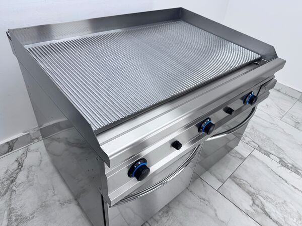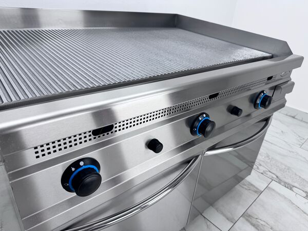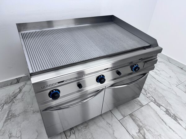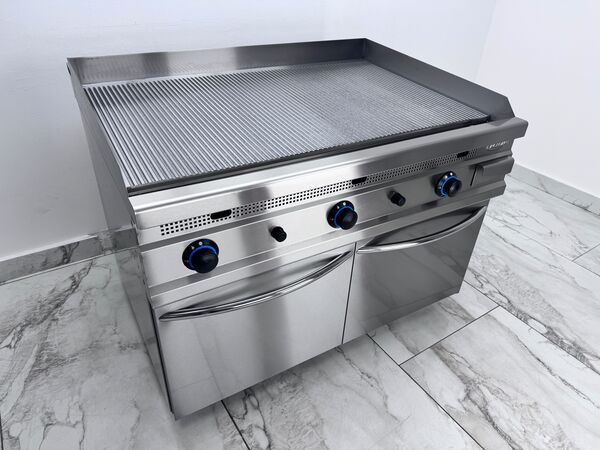 Gratar pe butelie cu corp din inox, prevazut cu placa striata cu grosime de 15 mm. Constructie robusta, durabila si usor de curatat, ideala pentru utilizare profesionala in bucatarii comerciale, restaurante sau unitati de catering. Echipat cu 3 zone de ardere independente, fiecare arzator functionand separat pentru control precis al temperaturii. Dispune de valva de siguranta si termocuplaflacara pilot (flacara de veghe) si sertar colector pentru scurgerea grasimii, usor de detasat si curatat. Montat pe suport din inox cu spatiu de depozitare inferior, ideal pentru pastrarea ustensilelor sau accesoriilor de gatit.